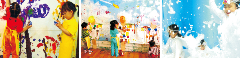 밀가루를 뒤집어 쓰고 천장에 흙덩이를 던지며 아이들이 표현의 한계를 훌쩍 뛰어넘는 체험 놀이 미술입니다.